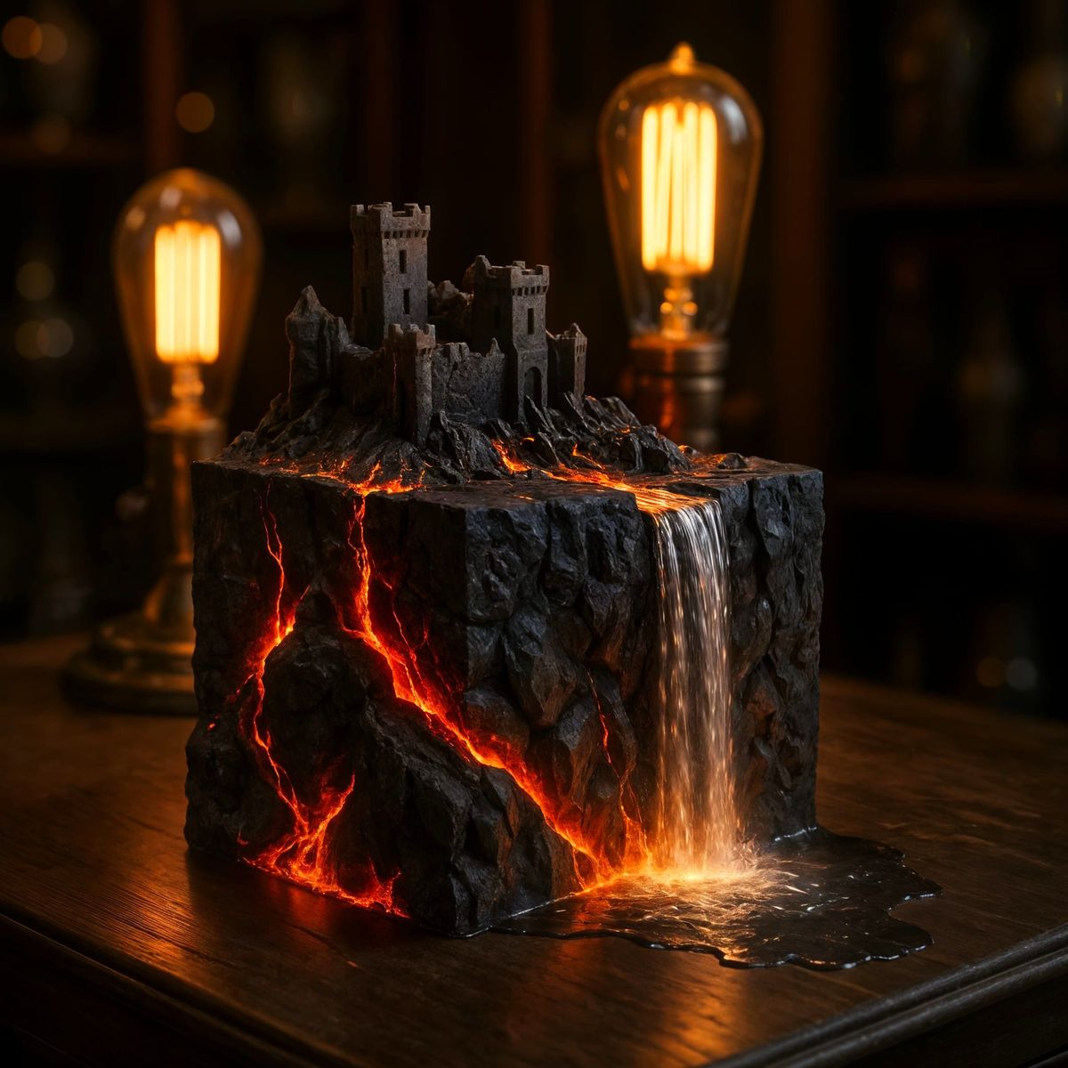This image shows a miniature, fantastical landscape with medieval fortifications, volcanic lava, and a waterfall, all bathed in the warm glow of incandescent vacuum tube lamps, set within a vintage diorama on a table in a dark room.