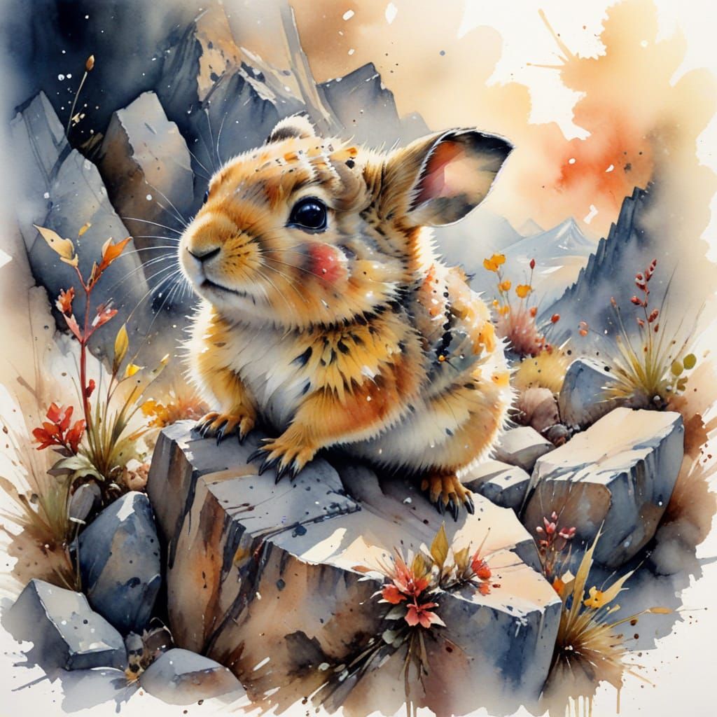 This image shows an adorable, wide-eyed pika peeking from between alpine rocks, its body puffed against the crisp mountain air. Created with a fine ink and watercolour blend.