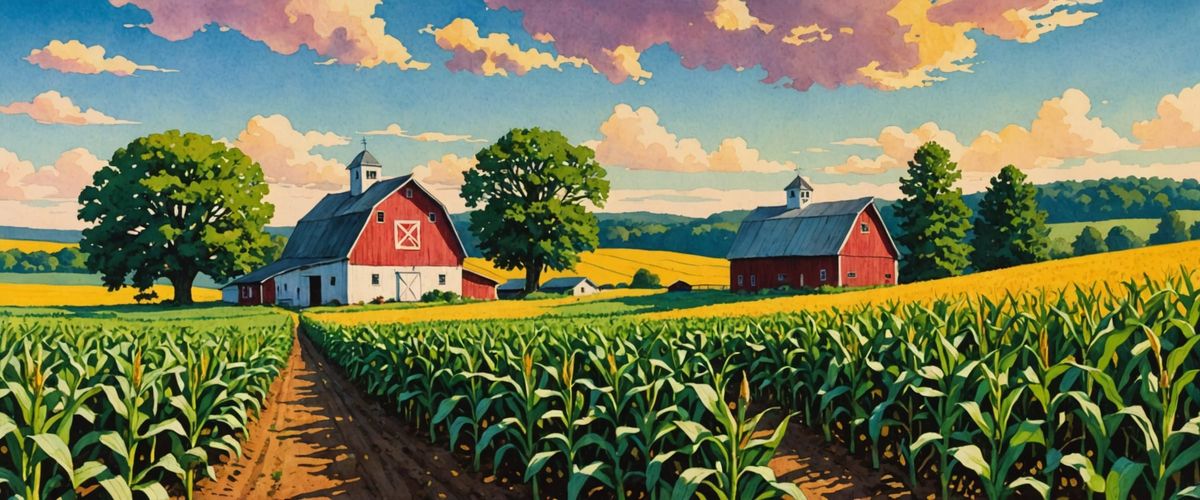 This image features a charming farmhouse and barn adorned with Pennsylvania Dutch hex signs, set against a cornfield under a bright, cheerful sky. Rendered in a naive comic book style with watercolor and gouache textures.