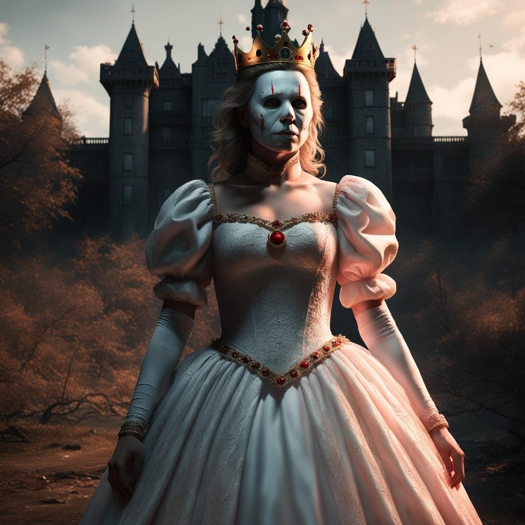 A digital artwork of a menacing figure in a princess gown within a derelict castle. The piece uses cinematic lighting, bokeh effects, and muted tones punctuated by gold and red.