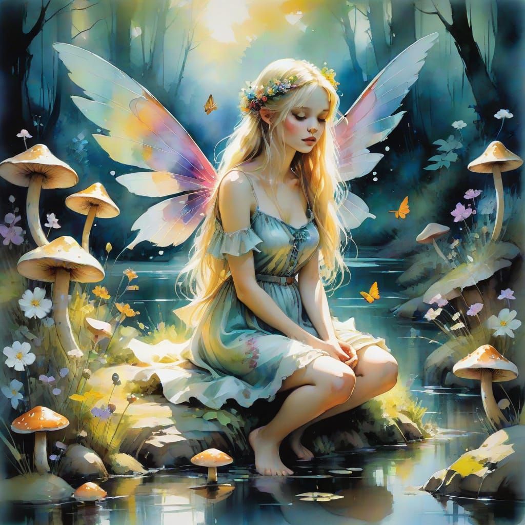 This image shows a fairy with blonde hair and iridescent wings sitting on a riverbank in an enchanted forest. The watercolor art style features delicate washes, loose brushstrokes, and warm lighting.