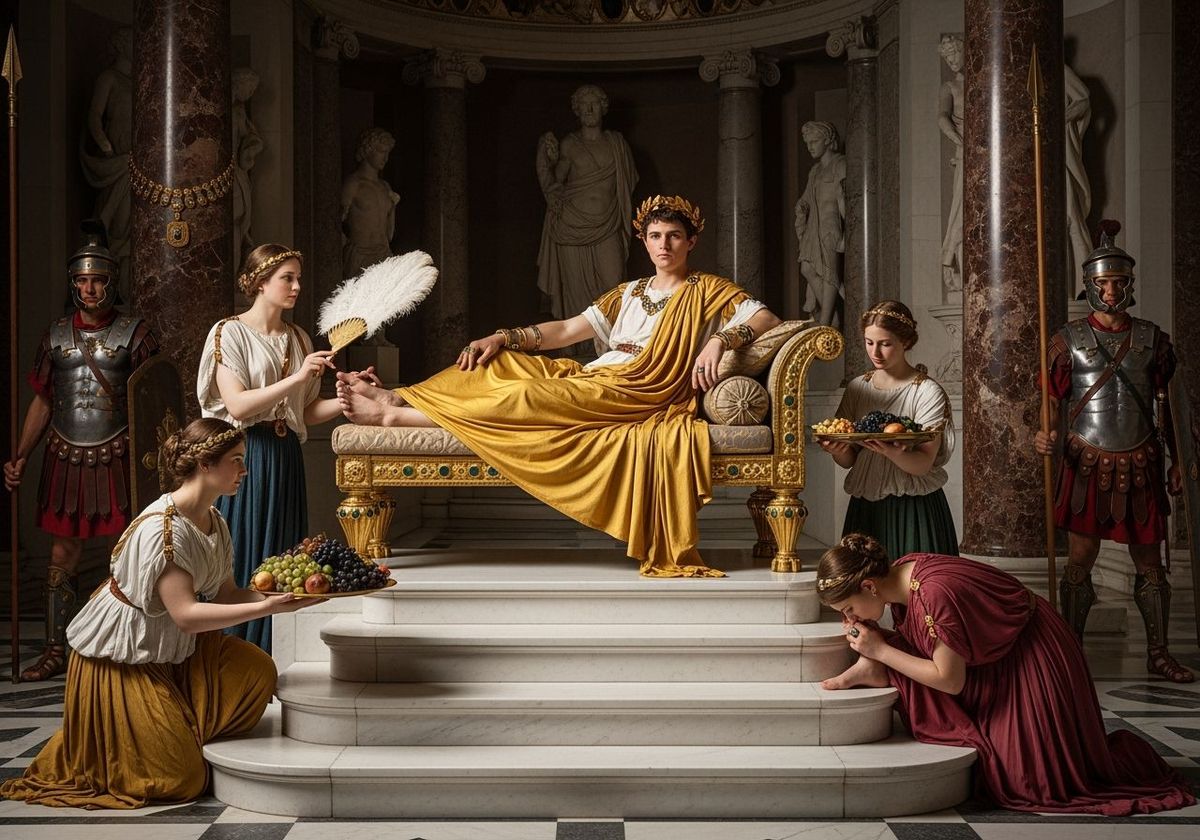 This image shows Emperor Caligula reclining on a chaise lounge in his palace throne room, attended by servants. The scene is reminiscent of dramatic baroque paintings with rich colors and dynamic composition.