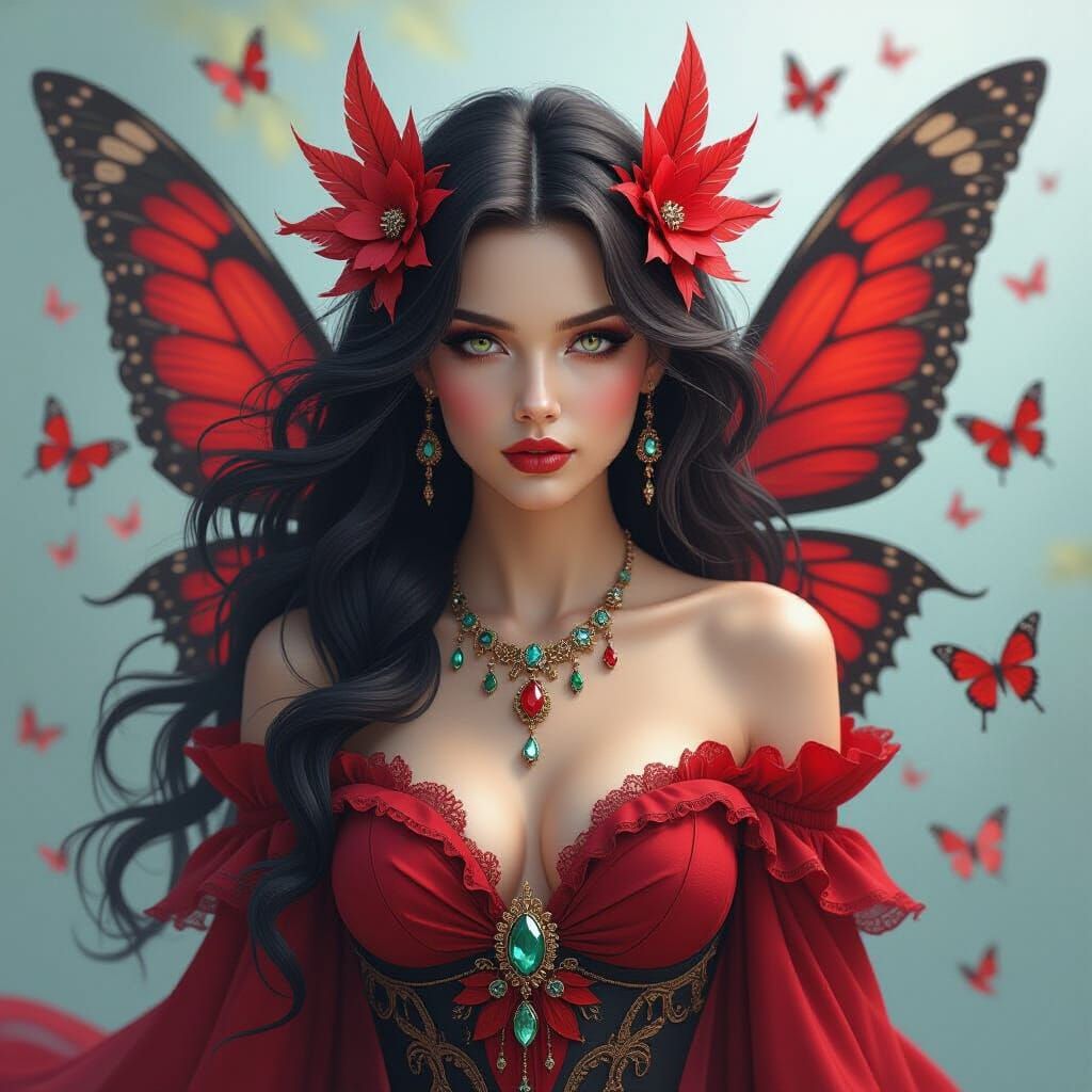 oil and airbrush portrait of a dark-haired adult fairy with intense eyes, all around her and incorporated into her dress and hair are rags, feathers, jewels, butterflies, all in shades of red and filling the picture, dark bg