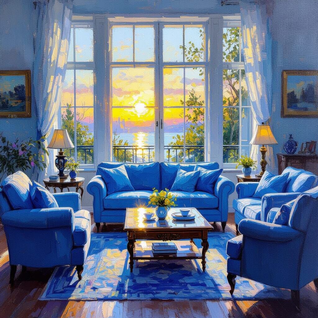 This image shows a cozy living room filled with blue furniture, bathed in warm sunset light. Sunbeams create a serene atmosphere, captured in a textured oil painting style with visible brushstrokes.