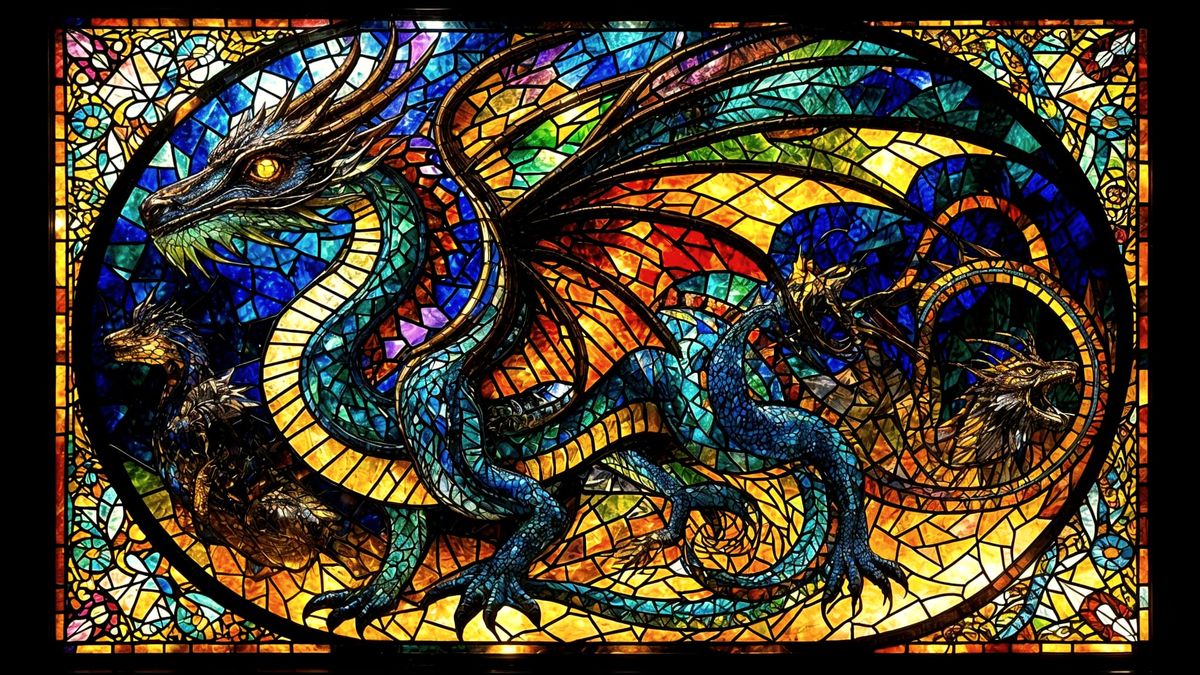 This image depicts a stunning mosaic stained glass window of a celestial dragon. Rich jewel tones and golden light create a dazzling kaleidoscope effect with elegant 3D shading.