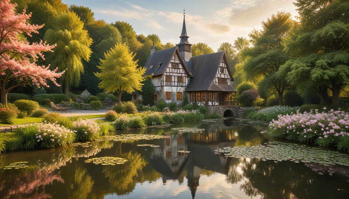 This image showcases a picturesque half-timbered cottage with a slate roof, nestled beside a calm pond. Blooming cherry blossoms and lush gardens create a serene, pastoral scene bathed in golden hour light.