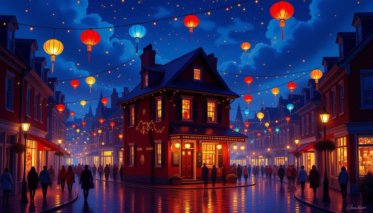 This image depicts a vibrant city street during a Festival of Lights, centered on a warm house. Swirling, colorful lanterns and dynamic motion create a sense of joyful chaos and lively celebration under a dark sky.