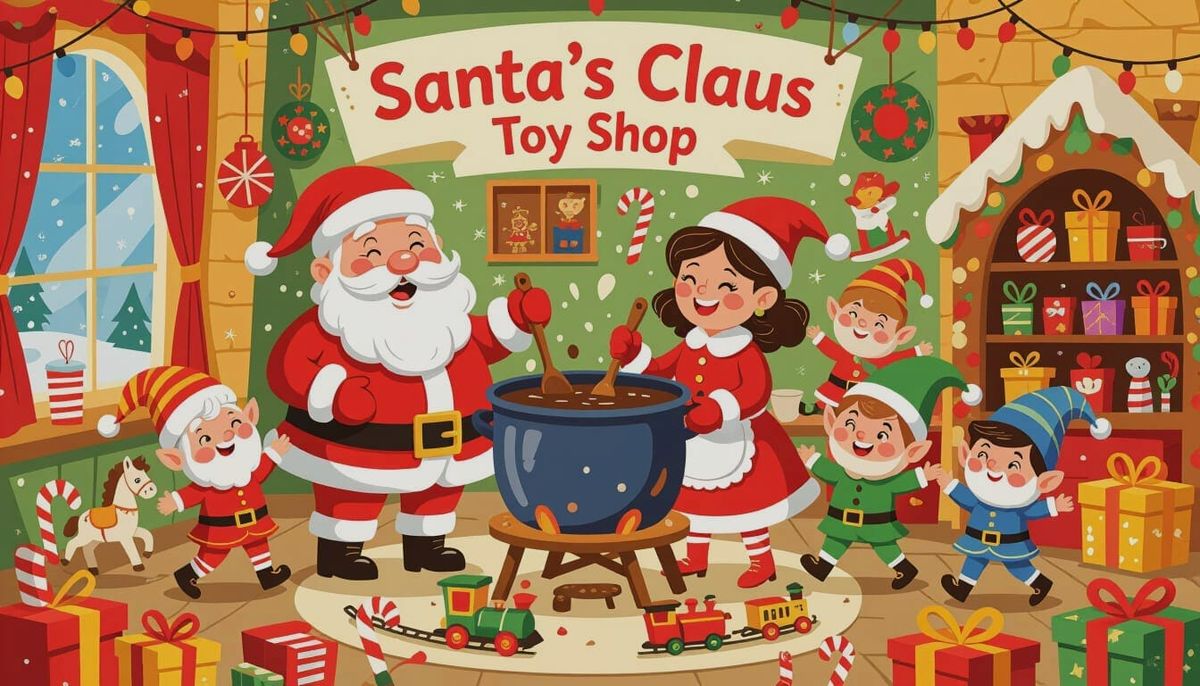 "A playful cartoon-style scene inside Santa’s toy shop: Santa Claus with rosy cheeks and a jolly belly laughs as Mrs. Claus stirs a big pot ...