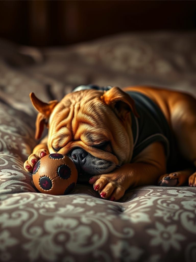 This serene image captures a sleeping bulldog resting peacefully on a plush mattress, surrounded by intricate patterns and textures, evoking a cinematic film still quality with subtle grain and warm lighting.