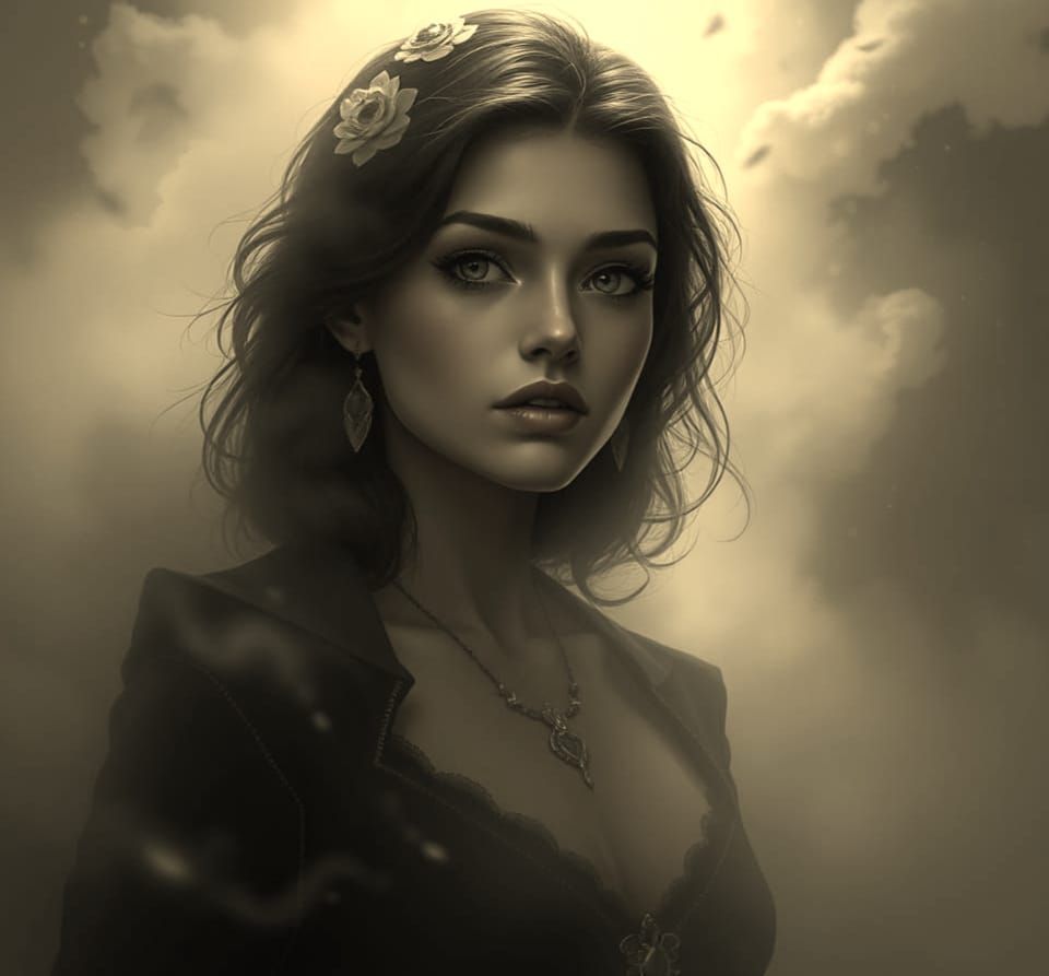 This image depicts a young woman veiled in fog, evoking mystery and a hauntingly beautiful atmosphere. It combines vintage eerie aesthetics with dark fantasy elements for a cinematic feel.