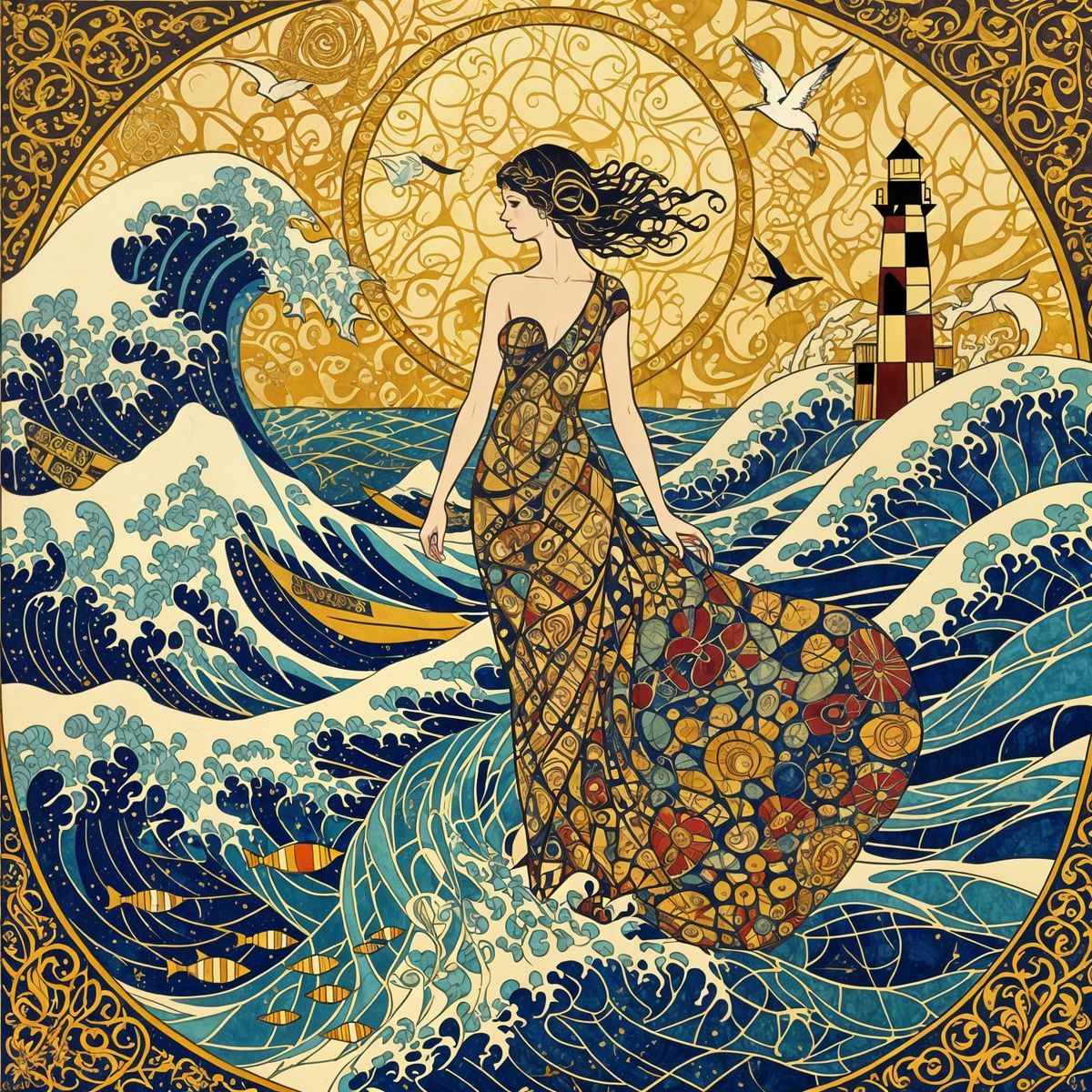 A captivating image of a woman merging with ocean waves. The artwork blends golden ornamental patterns with bold geometric abstraction, dramatic ink effects, and intricate linework, reminiscent of Art Nouveau in jewel tones.