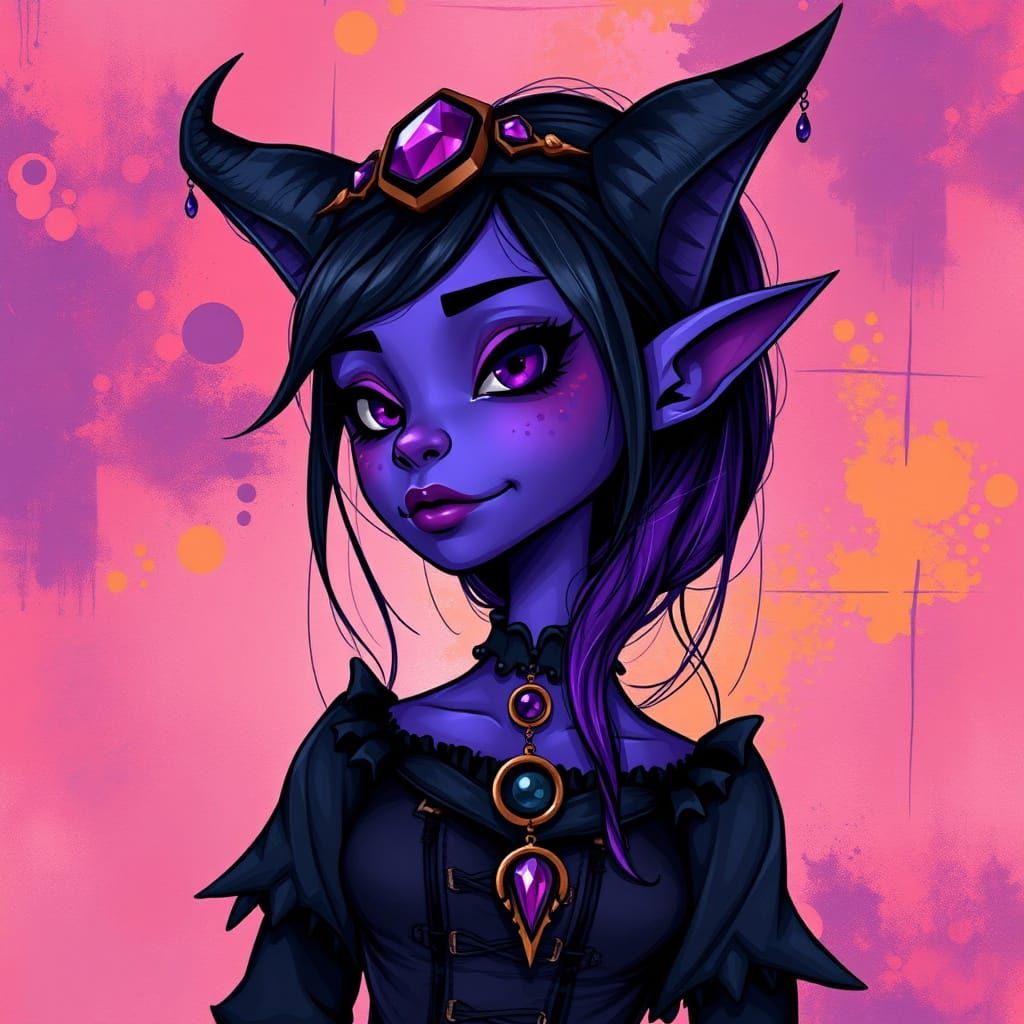 This image shows a purple-skinned night elf woman in goth attire. The artwork features abstract elements, complementary colors, and fine details, creating a visually striking and unique aesthetic.