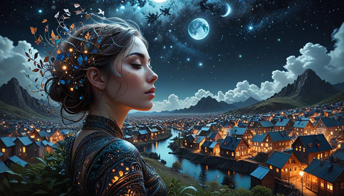 This image depicts a serene, surreal dreamscape at night. The scene features a zentangle girl on a mountain with the word 'dreams' in the sky, rendered with hyperdetailed precision and a dry pastel aesthetic.