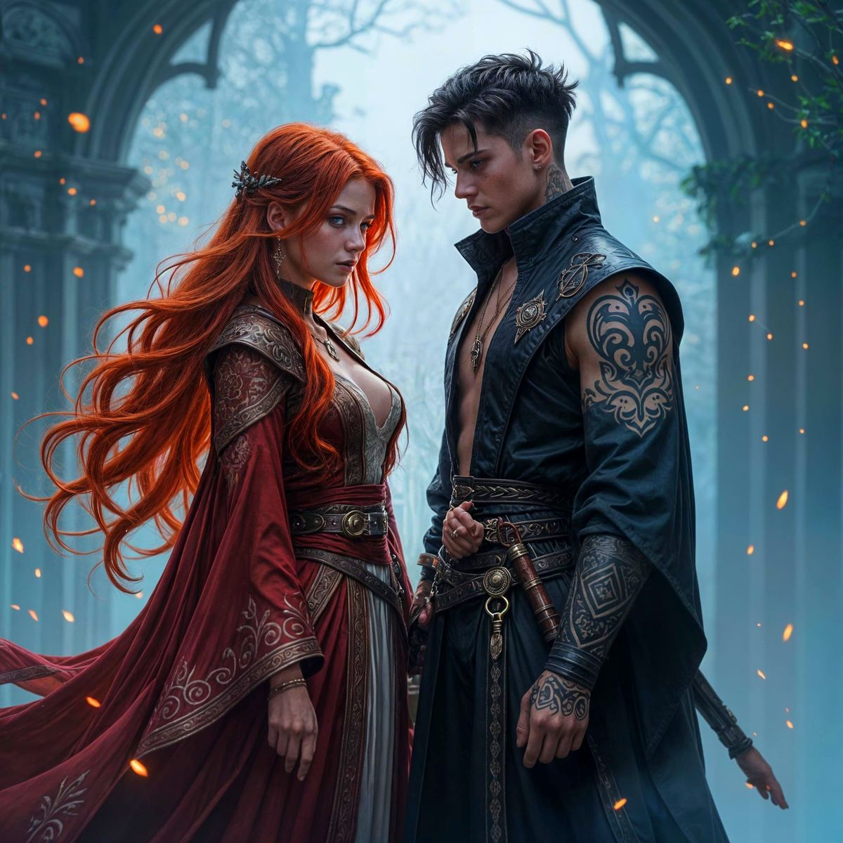 This image shows a spark mage with long red hair alongside a tattooed man, set within a mystical atmosphere filled with sparks and shadows. The scene is reminiscent of a cinematic film still.
