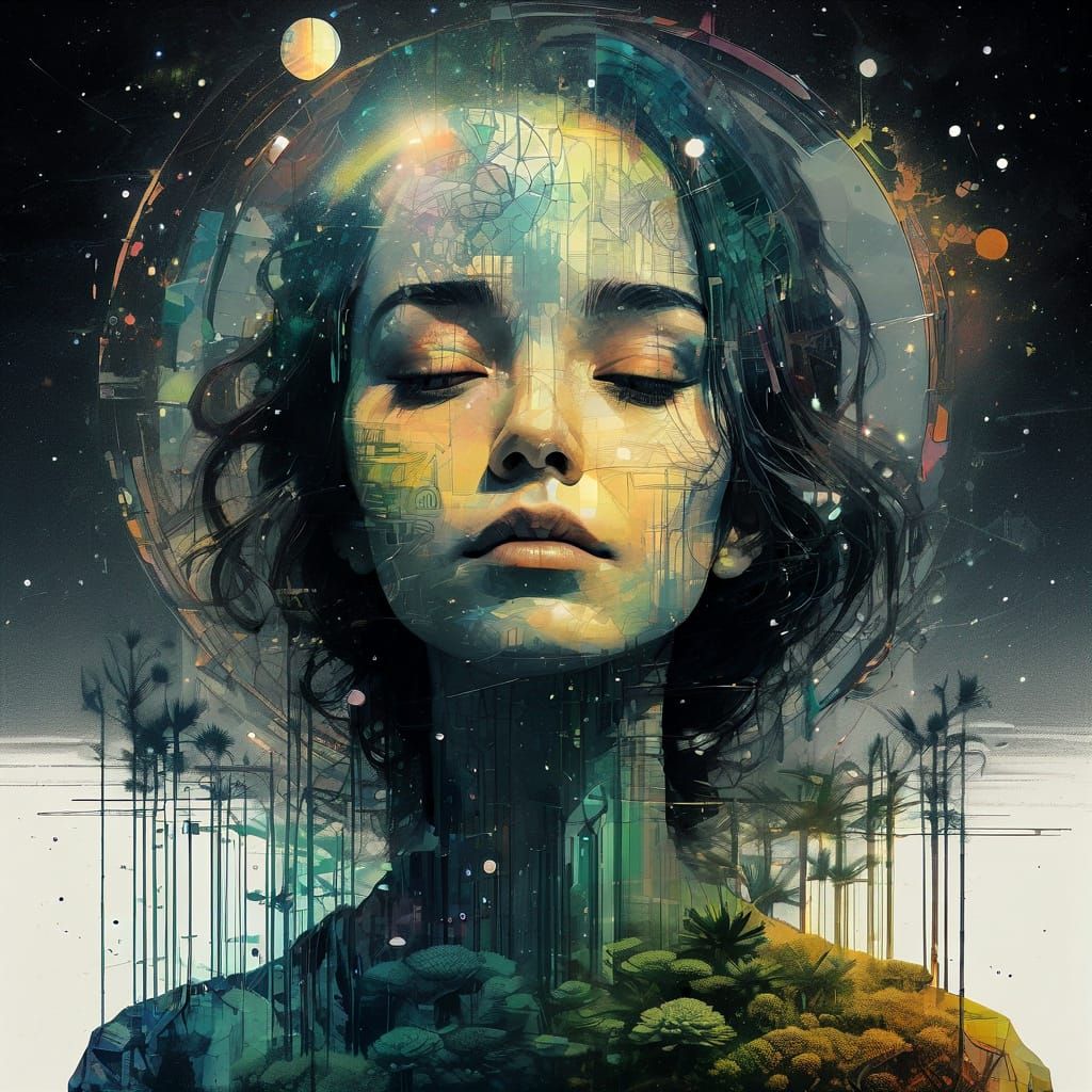 A surreal image of a pixelated portal opening onto a landscape of rainbow dunes where succulents grow. A galaxy drips into the world, in a maximalist style reminiscent of double exposure photography.