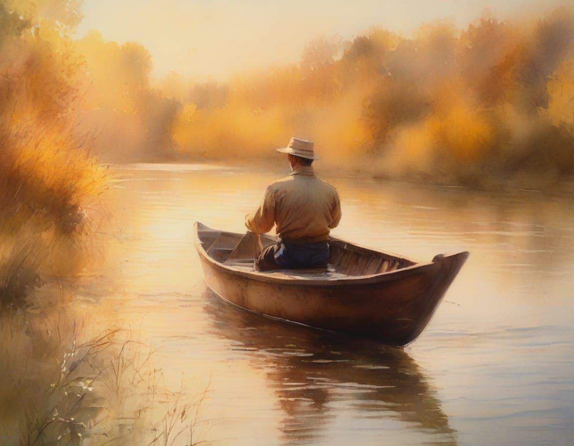 A watercolour painting of a person punting on a river in soft focus. The artwork features whimsical brushstrokes, tetradic colours, and a golden hour glow to create a serene atmosphere.