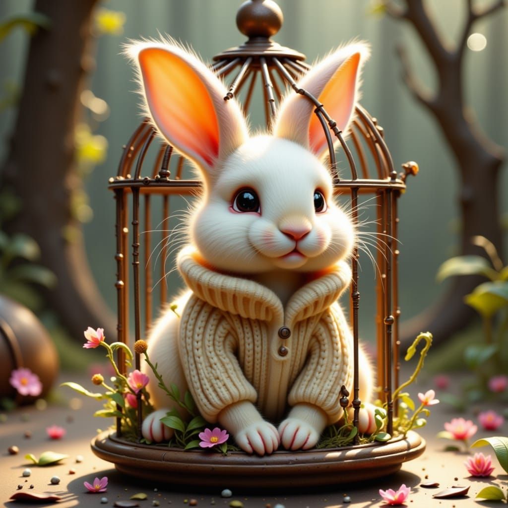 This image shows a fluffy bunny wearing a cream sweater inside a vintage birdcage. It is lit with golden light and rendered with delicate textures, in a whimsical fantasy style.