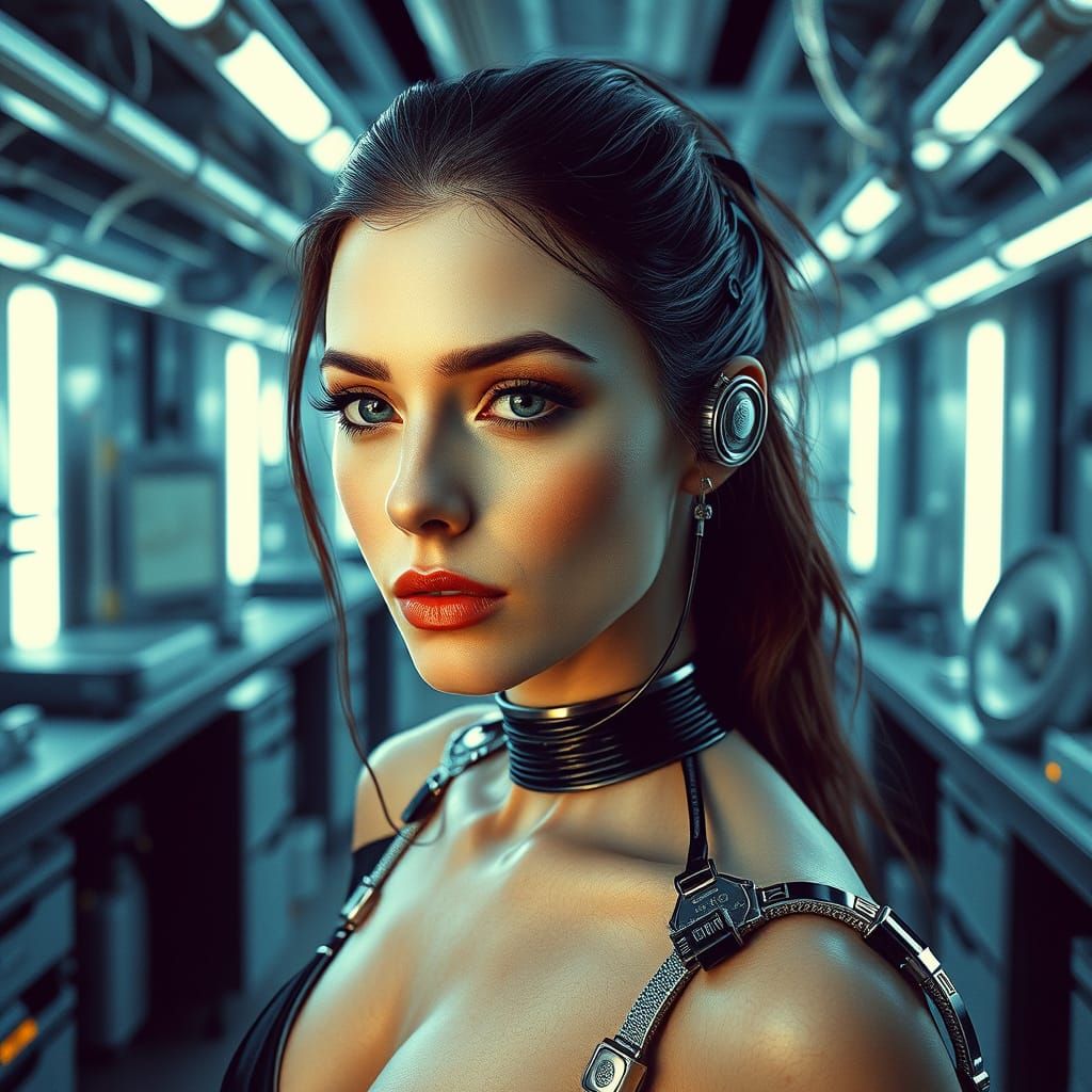 This image shows an elegant woman with cybernetic enhancements in a futuristic laboratory. The scene is 4K photorealistic, with an organic aesthetic and elements of cinematic design.