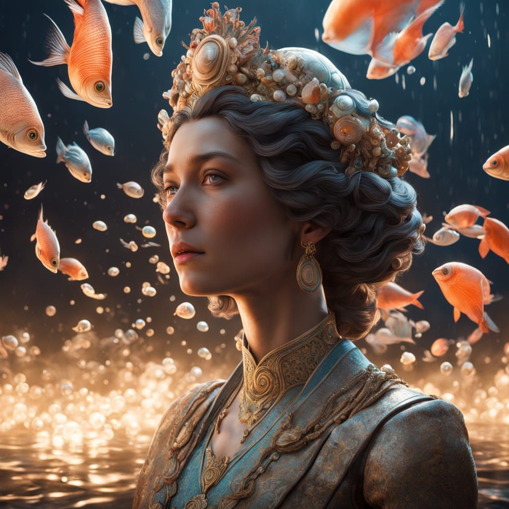 A fantasy realism portrait of a regal woman wearing a crown of coral, shells, and pearls. Glowing fish and bubbles create an ethereal, underwater atmosphere with cinematic lighting. Highly detailed concept art.