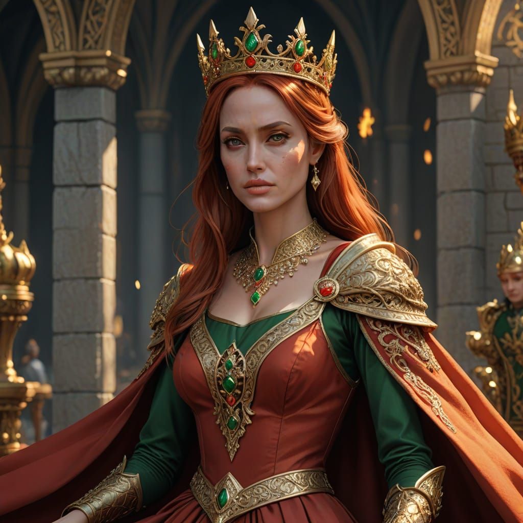 Lady medieval red hair green eyes red dress orange crown gold throne Angelina Jolie By artist "anime", 3d anime art, inspired by WLOP, Artstation, #genshinimpact pixiv, extremely detailed, aesthetic, concept art, ultrafine detail, breathtaking, 8k resolution, vray tracing
