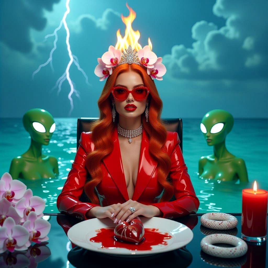 A striking picture of a red-haired woman wearing a burning crown and sunglasses, seated at a desk with aliens and anatomical heart. The backdrop features a stormy ocean view in a hyperrealistic aesthetic.