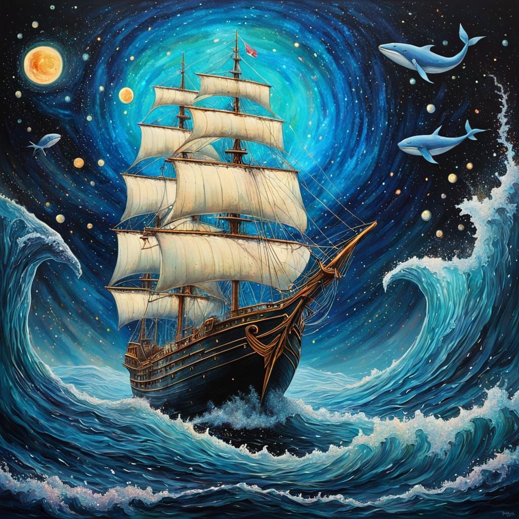 A surreal image of a whale-shaped sailing ship navigating the cosmos. The vessel features sparkling sails that have captured stars, leaving a glowing stardust trail in its wake, rendered with vibrant colors in a maximalist fine art style.