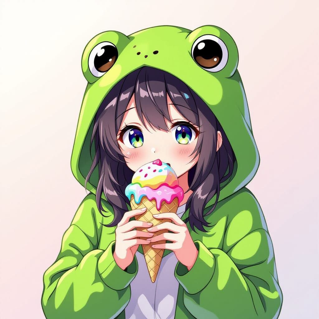 This image shows an adorable girl in a frog kigurumi enjoying ice cream. The anime art style features meticulous details, clear lines, and cinematic lighting with rich colors.