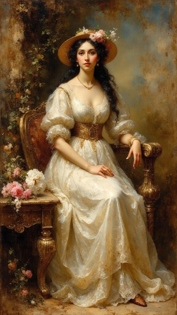 This image shows an artistic portrait of a beautiful Colombian woman reminiscent of the 1800s. The portrait is rendered with impressionistic techniques and ethereal, flowing lines.
