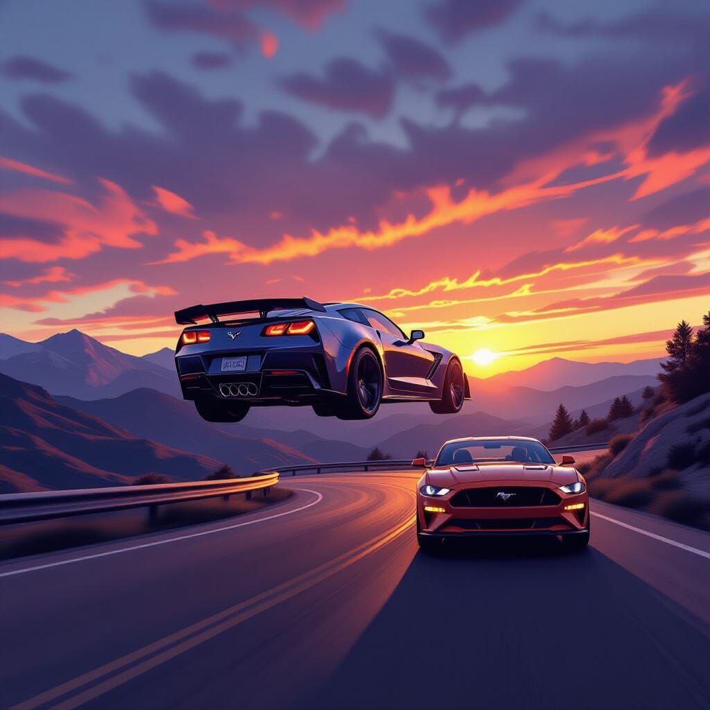 This dynamic concept art depicts a 6th gen ZR1 Corvette soaring over a 6th gen Mustang on a mountain road. Dusk lighting creates dramatic shadows and vibrant skies, emphasizing motion and sharp detail.
