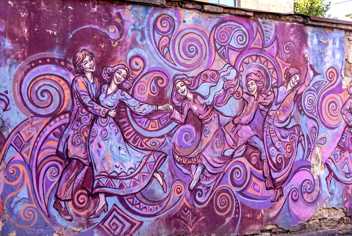 This image showcases a vibrant parade with people prancing amidst swirling psychedelic patterns. The artwork features a rich palette of purple tones, evoking a passionate and provocative feel.