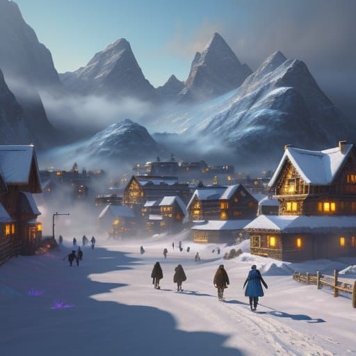 A vibrant oil painting of a snow-covered village nestled among mountains, with people walking about. Golden light shines through the mist, creating icy blue and purple hues in this fantasy scene.