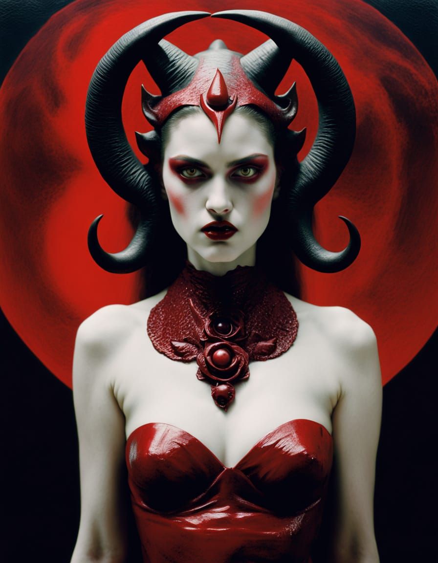 A haunting, lyrical abstract image of a demonic goddess, juxtaposed in a nightmarish, crimson-hued atmosphere, blending horror and tonalism in a mixed media art piece