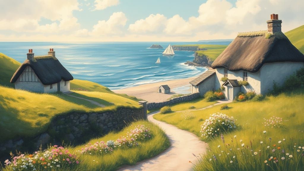 This enchanting image depicts a charming thatched cottage nestled in Ireland's rolling hills, surrounded by wildflowers, overlooking the sea and a tranquil beach with sailing boats and crashing waves, painted in a soft, dreamy style reminiscent of Beatrix Potter and Joaquin Sorolla.