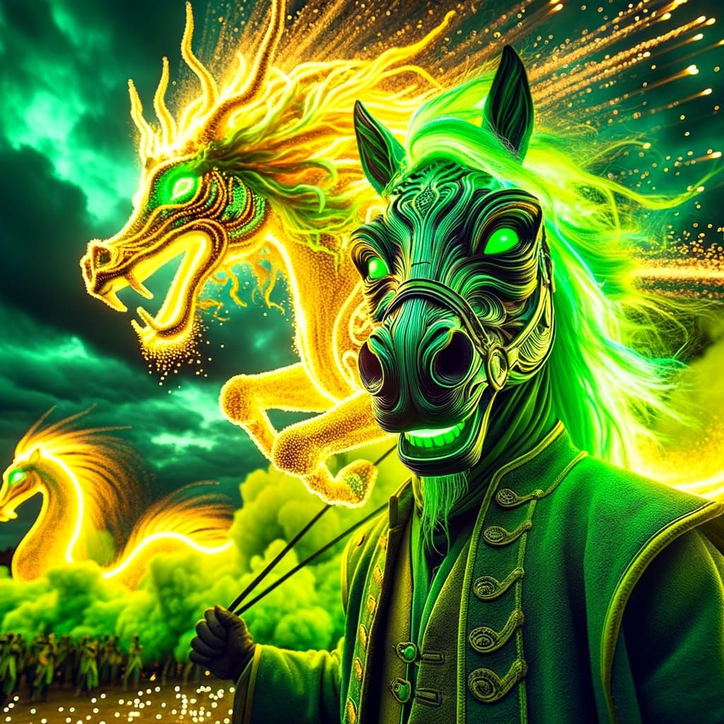 This image depicts a humanoid horse with leprechaun and jester traits, surrounded by vibrant sparks of a Qilin, set against a magical neon lime-green sky with yellow clouds.