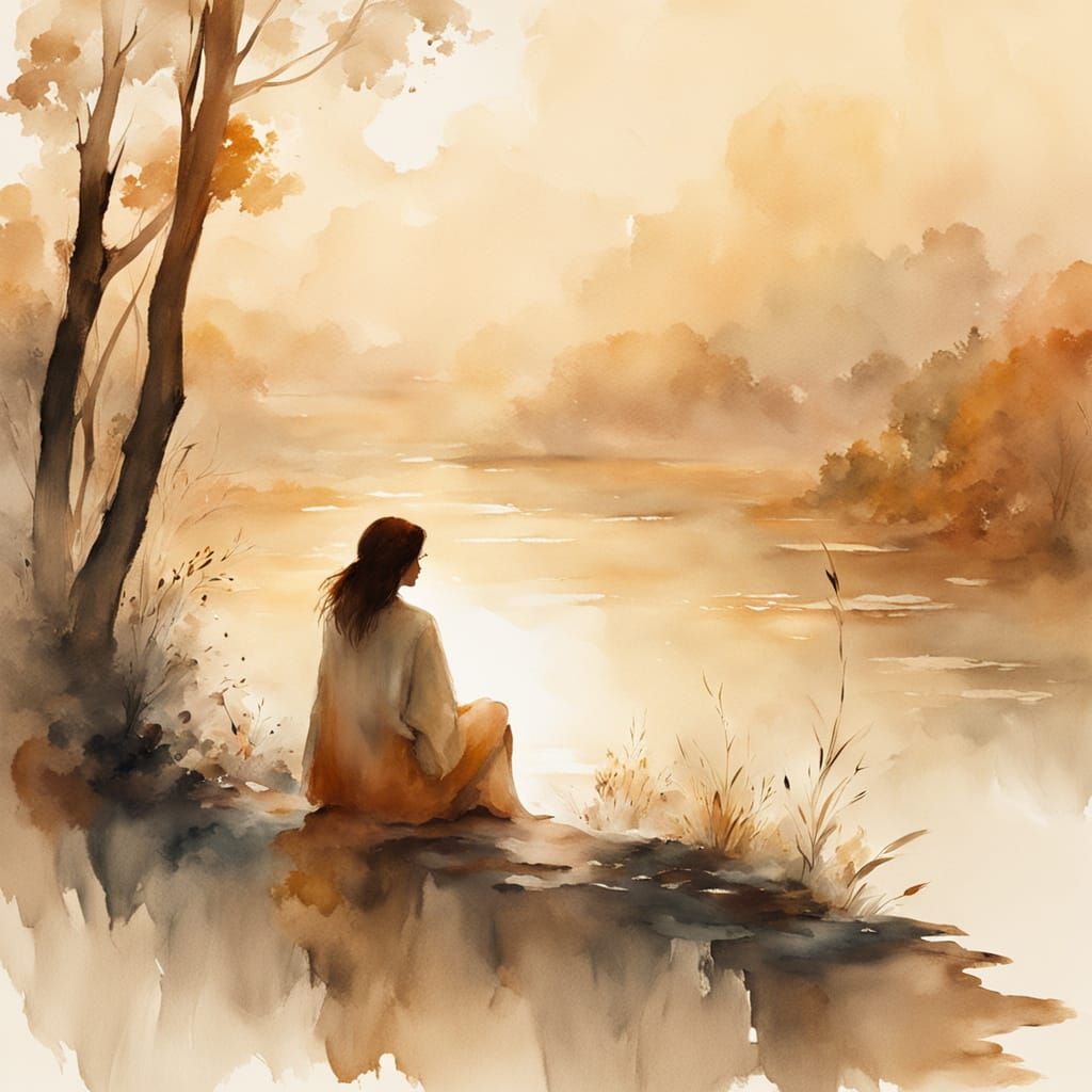 This image is a soft, impressionist watercolor of a woman with burn hair sitting in a serene natural setting, with gentle, feathery textures and warm, golden tones