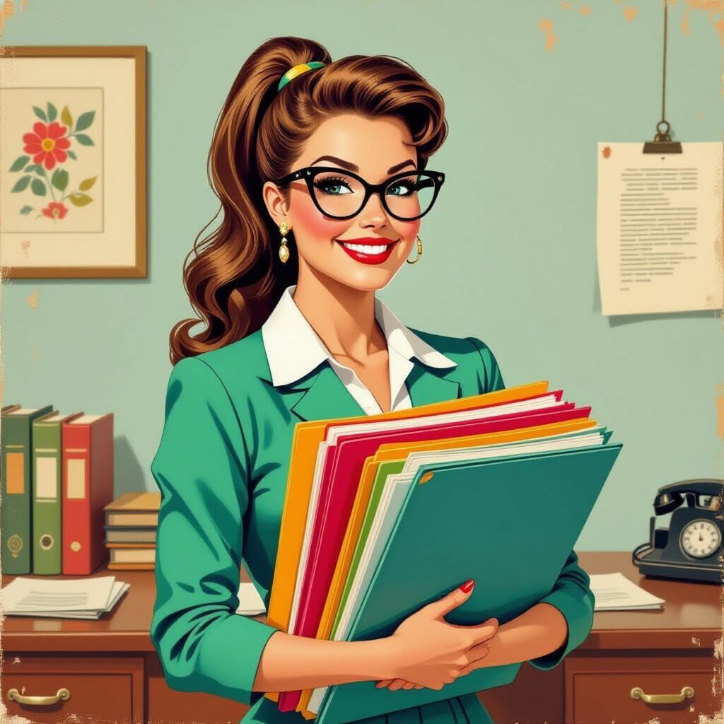 A vintage illustration of a smiling secretary with cat-eye glasses holding folders in a retro office. The artwork evokes a mid-century aesthetic with bold strokes and vibrant colors.
