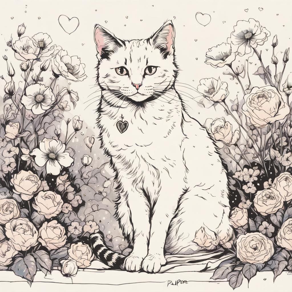 A charming image of a cat nestled on a pillow amidst flowers, enhanced by delicate heart-shaped lights. The artwork showcases a dynamic comic book aesthetic.