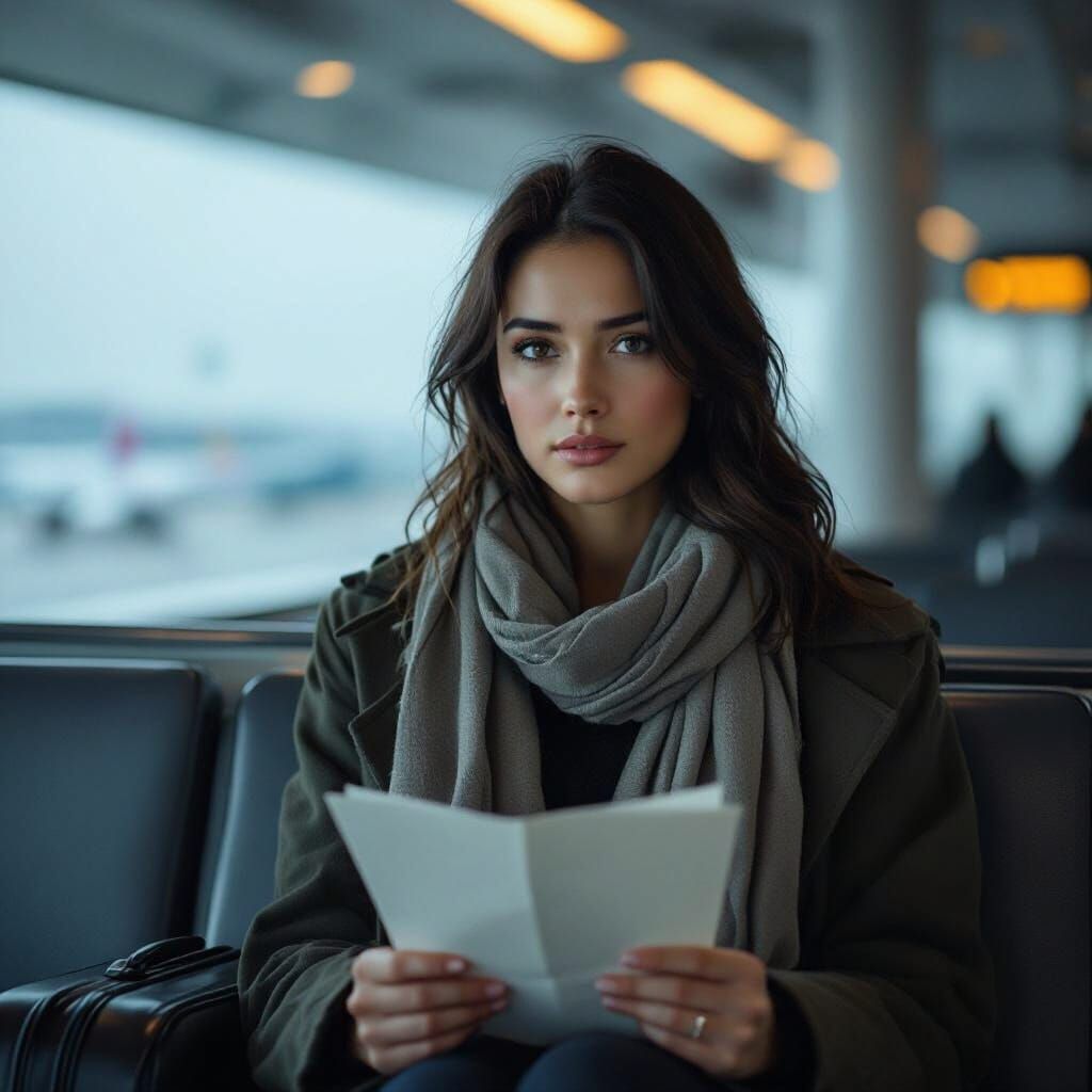 A solitary woman sits in a dimly lit airport, a suitcase nearby. Holding a letter, her expression reflects thoughtful contemplation, with subtle cinematic realism and emotive depth.