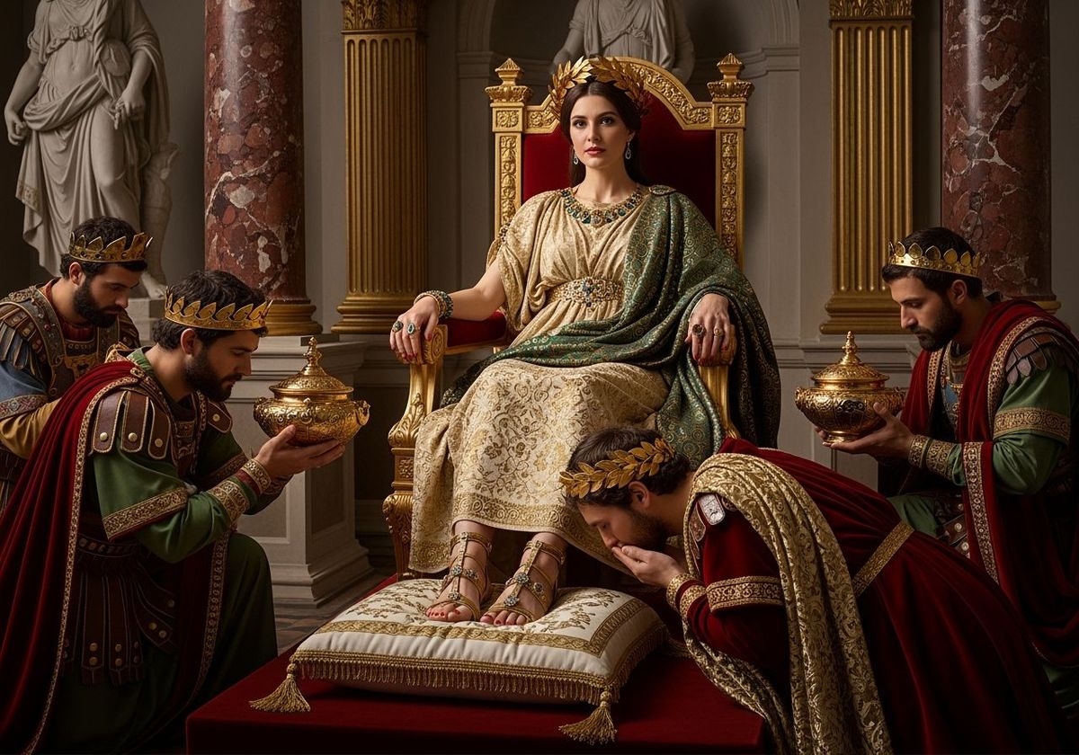 This image shows a Roman Empress regally seated on a golden throne. She is presented with riches as kings kneel before her in a luxurious throne room with marble columns, rendered with sharp focus and natural lighting.