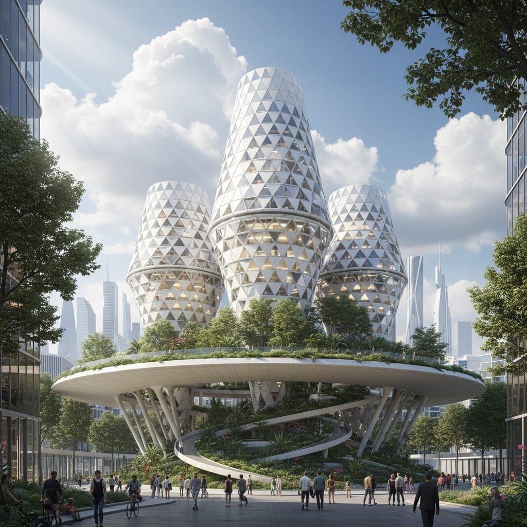 This image showcases futuristic organic apartments shaped like interconnected, stacked cones, rendered in a digital matte painting style with fluid architectural forms and bright, sun-drenched lighting.