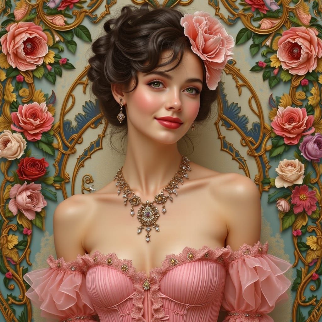 A photorealistic image of a smiling, elegant European woman in a striped pink corset dress. The artwork is reminiscent of fashion photography, with hyperrealistic details and soft lighting.
