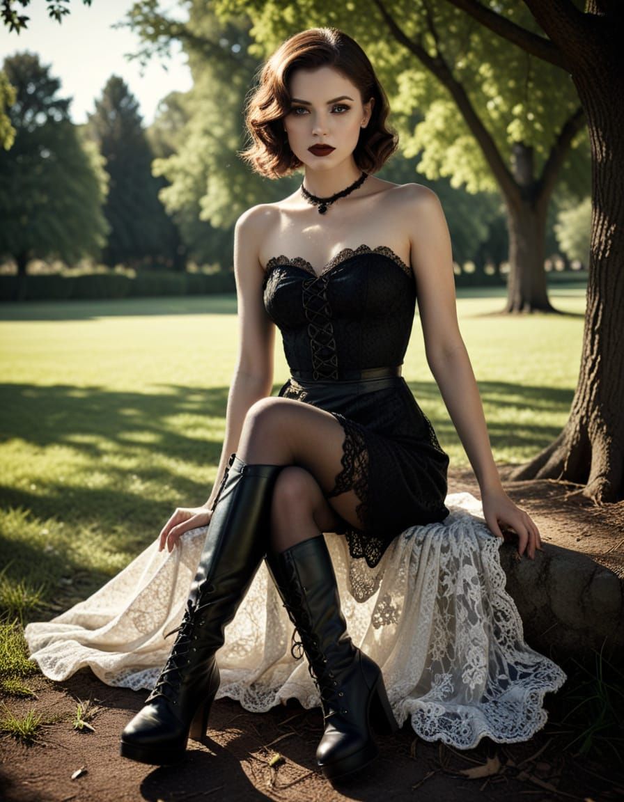 A dramatic gothic portrait captures a woman in a park, styled in film noir. Features include striking shadows, lace details, and moody, high-contrast black and white lighting.