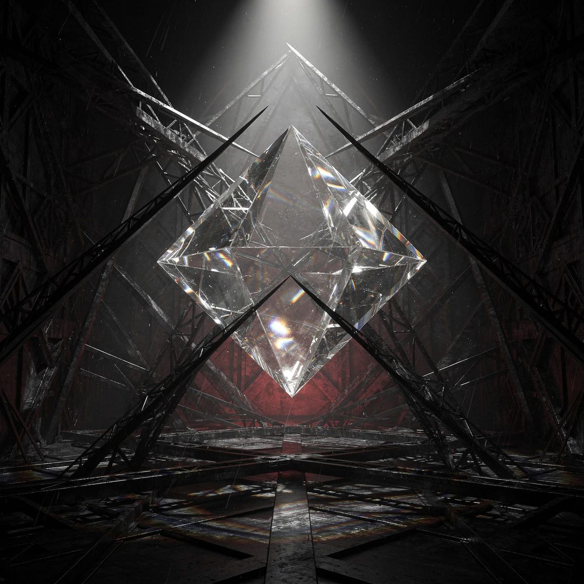 This image showcases abstract, gothic geometric designs with metallic elements, reflecting and refracting like diamonds and glass, creating an epic surrealist composition.
