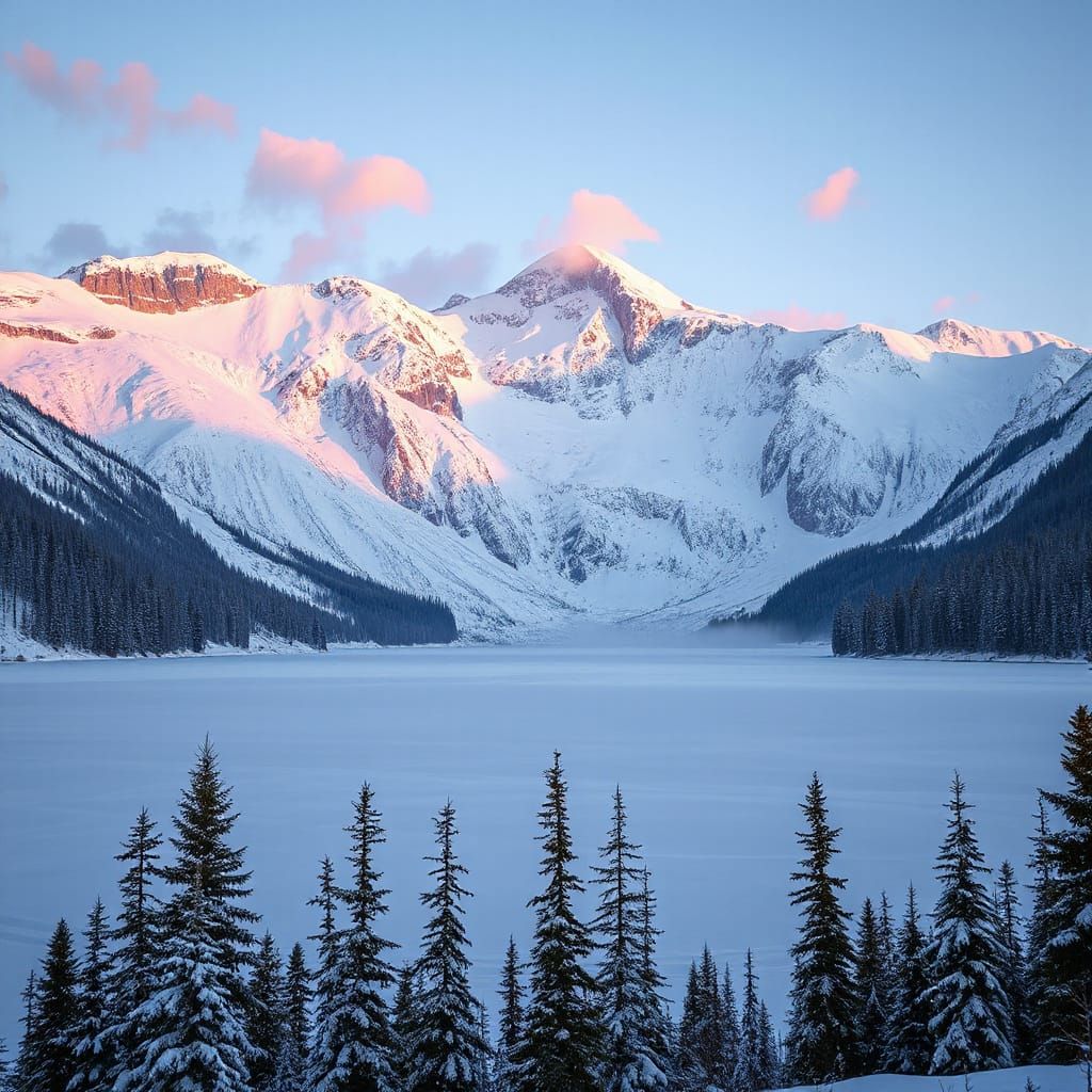 A vast winter mountain landscape at sunrise, with towering snow-covered peaks glowing in soft pink and golden light. A frozen alpine lake in...