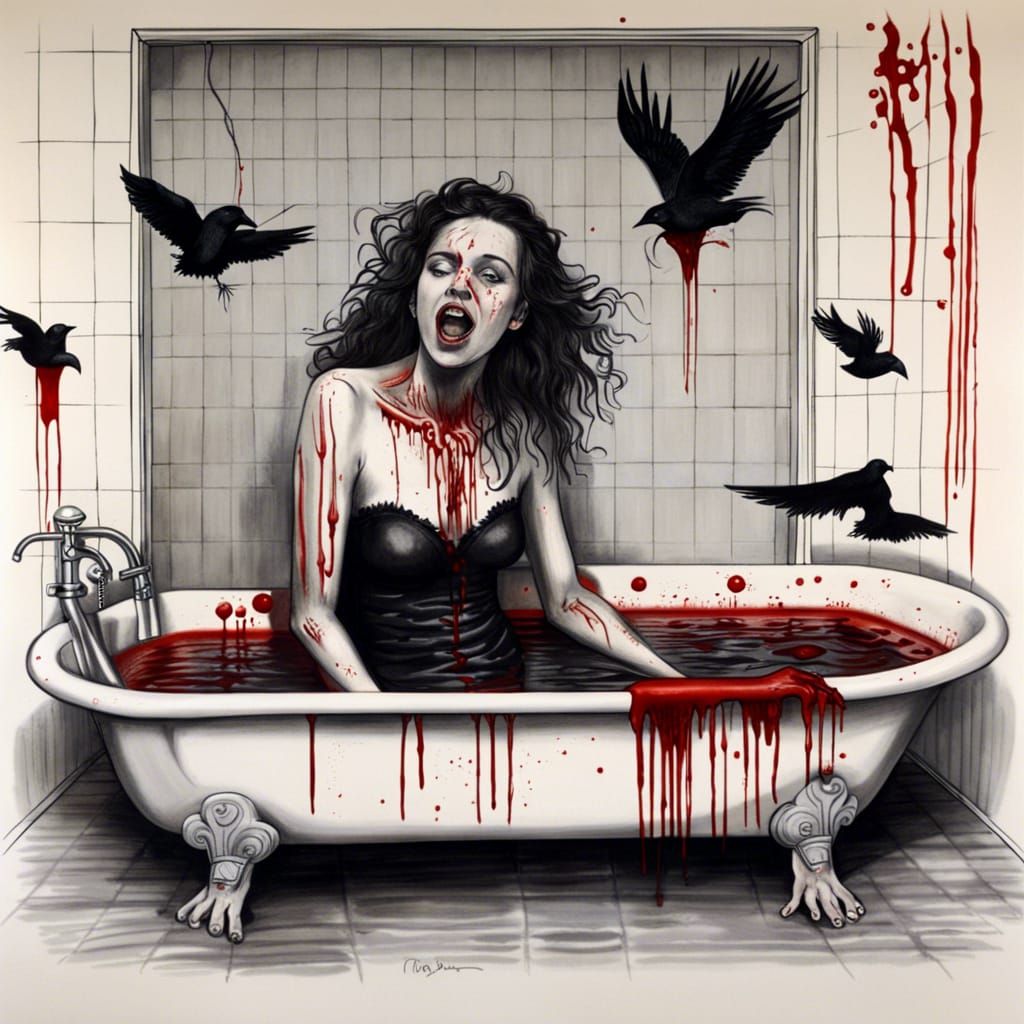 This image shows a woman in a bathtub with blood. Black crows are in the room. The image is a hyperdetailed charcoal drawing conveying a dark and unsettling atmosphere.
