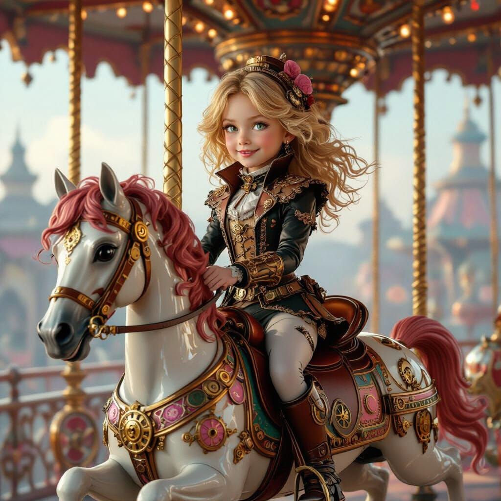A young girl with blonde hair and hazel eyes rides a detailed steampunk carousel horse. The scene features brass gears, copper accents, and pink hues, evoking a vintage futuristic style.