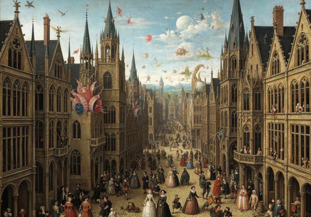 A fantastical cityscape blending gothic and baroque architecture. The image evokes the detailed and chaotic styles of Bosch and Bruegel.