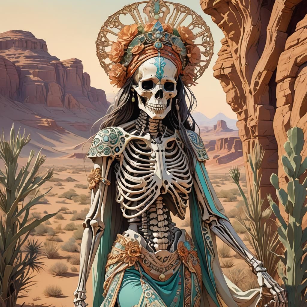 A medium shot of a skeleton in an African dress posed in a desert landscape. This image showcases an Art Nouveau style with pastel colors, delicate linework and soft lighting.