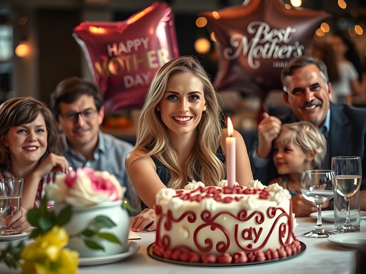 A beautiful woman, looking directly at the viewer with a happy expression, with long flowing blonde hair, seated at a restaurant table, with her family around her for a photo, including her husband, with an ornately decorated cake displaying "Happy Mother's Day" and a candle, with mylar balloon behind ...