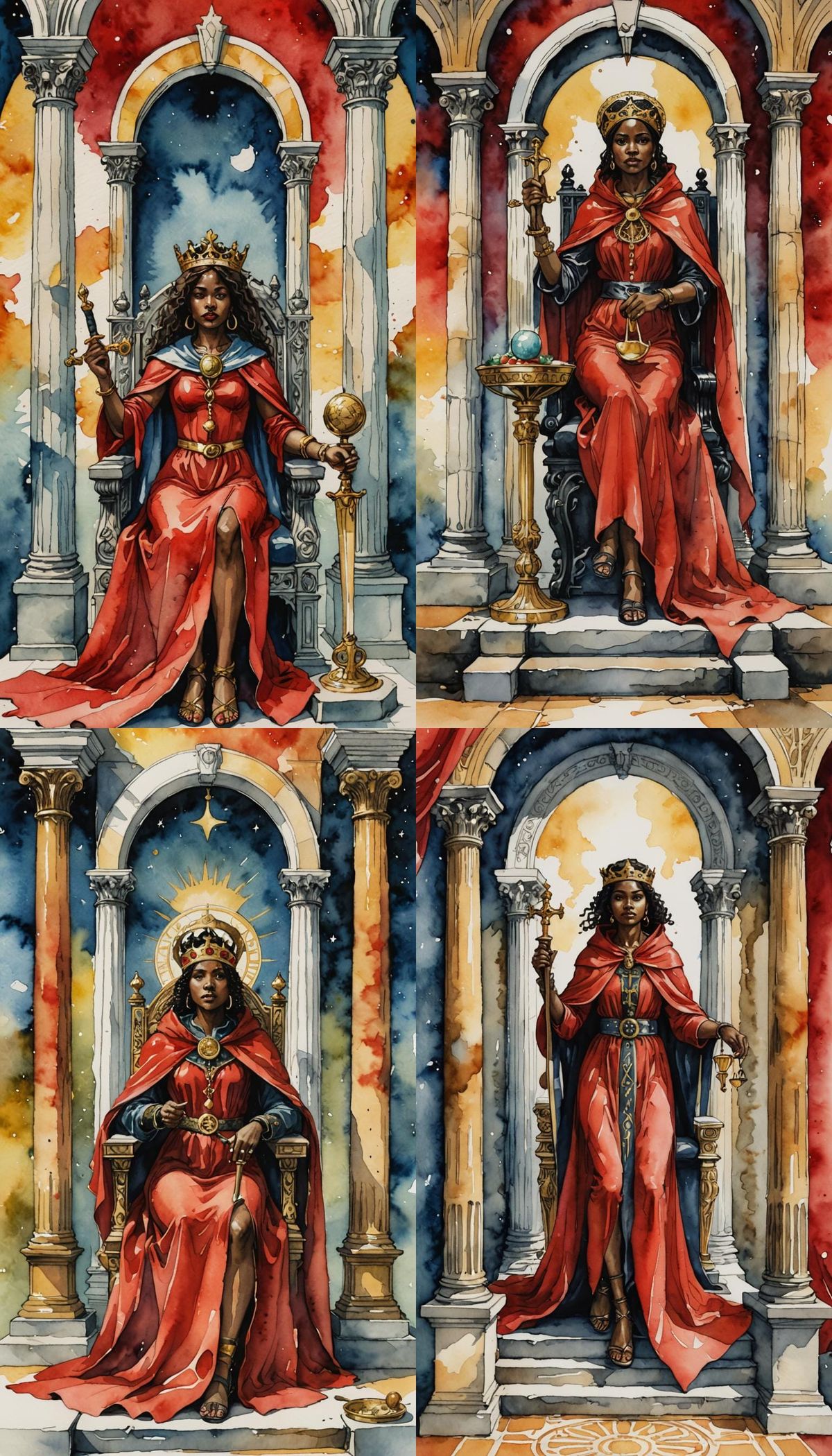 This image shows the Justice tarot card rendered as a watercolor painting. A Black woman sits enthroned, wearing a red cloak and blindfold, holding scales and a sword before an arched background.